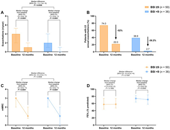 A significant improvement in the exacerbation rate at 12 months was found in both the BSI ≥9 [−2 (95% CI: −3 to −2), p < 0.0001] and the BSI <9 cohorts [−1 (95% CI: −2 to −1), p < 0.0001], with a between-group difference of −1 (95% CI: −2 to 0) exacerbations per year (p = 0.0209) (Figure 1A). The proportion of patients with ≥3 annual exacerbations decreased by 52% in the severe bronchiectasis group and 36.2% in the mild/moderate group (Figure 1B).