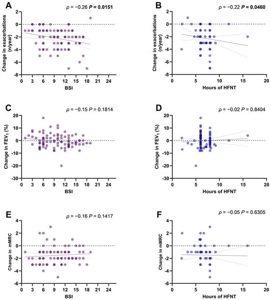 The change in the annual exacerbations rate was significantly correlated with the BSI (ρ = −0.26, p = 0.0151) (Figure 2A) and with the hours of HFNT use per day (ρ = −0.22, p = 0.0460) (Figure 2B). Changes in FEV1% (Figure 2C,D) and mMRC scores (Figure 2E,F) were not correlated with BSI or HFNT usage.