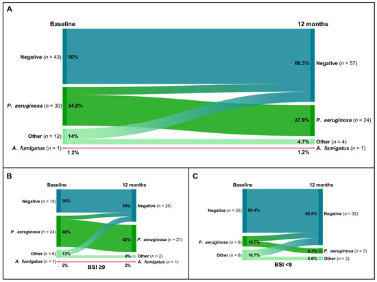 Sankey plots of microbiological colonization changes after 12 months of home HFNT in the overall cohort (A) and in the groups with severe bronchiectasis (BSI ≥ 9) (B) and mild/moderate bronchiectasis (BSI < 9) (C).