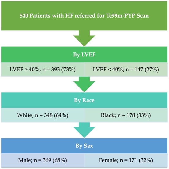 The study cohort comprised 540 patients with an overall prevalence of ATTR-CM of 154 (28.5%). The median age was 72 years, and 369 (68.3%) of the subjects were male. Out of the total cohort, 348 patients self-identified (64.4%) as White, while 178 patients (33.0%) self-identified as Black. Regarding LVEF status, 393 patients (72.8%) had an LVEF of 40% or higher (Figure 1). Detailed baseline characteristics are shown in Table 1.