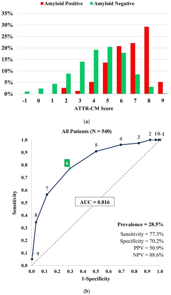 (a) Distribution of ATTR-CM scores in the 99mTc-PYP referral cohort (n = 540). (b) Receiver operating characteristic curve and performance measures of the ATTR-CM score in the 99mTc-PYP referral cohort (n = 540). The “high risk” threshold is set at a score of ≥6 to estimate sensitivity, specificity, PPV, and NPV.