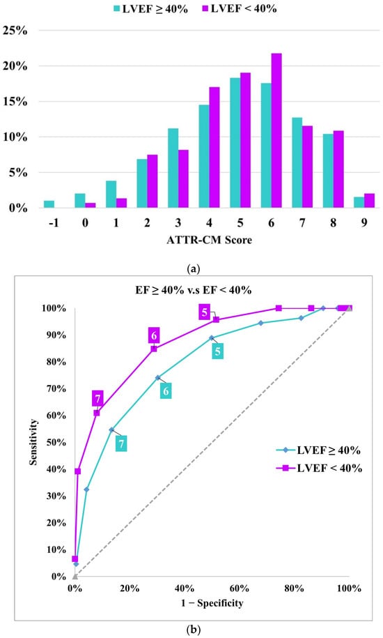 (a) Distribution of ATTR-CM scores in the 99mTc-PYP referral cohort stratified by LVEF. (b) Receiver operating characteristic curve and performance measures of the Simple ATTR-CM score across LVEF categories. The “high risk” threshold is set at a score of ≥6.