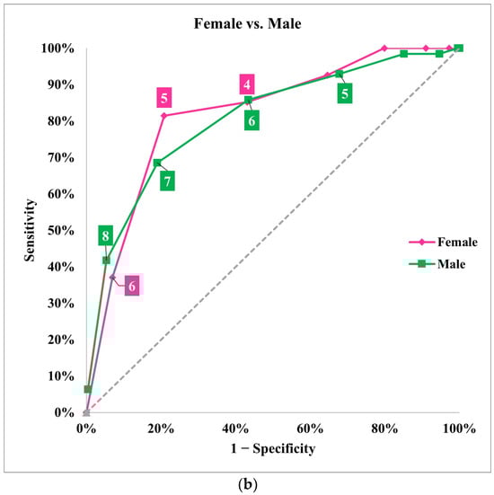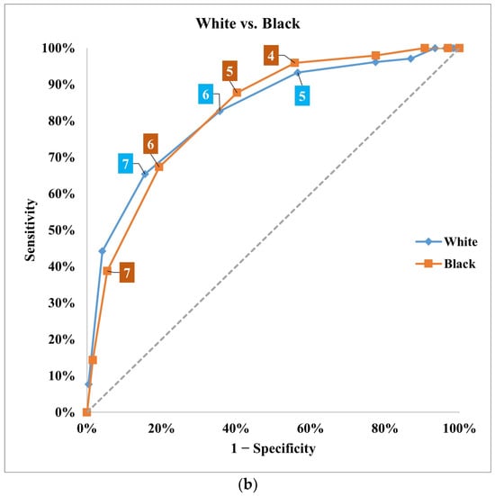 When utilizing a cutoff score of 6 for high-risk classification, the sensitivity of the ATTR-CM score was relatively lower in Black patients (67.3%) (Table 4). More importantly, sensitivity using this cutoff was remarkably low in females (37%) and particularly low in white females (20%) compared to black females (47%). Accordingly, specificity was higher in females (93.1%), with comparable PPV (50%) and NPV (88.7%) (Table 4). This is also observed in Figure 5b, where sensitivity drops remarkably in females when using a cutoff score of 6 as compared to 5. Detailed score performance in females was evaluated using a modified cutoff of 5, which demonstrated a better sensitivity of 81.5% in all females and 70% in White females (Table 4). This modification in the cutoff for females did not cause a significant change in specificity, PPV, or NPV, which remained comparable to score performance in the entire cohort using the original cutoff of 6.