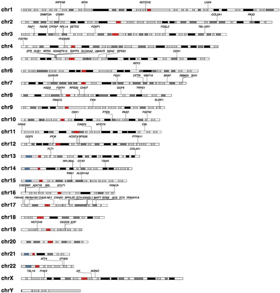 Overview of key genes linked with CM1 and CM1-associated syndromes. Genes were summarized from studies on individual patients, families, and larger cohort analyses [8,9,12,13,14,15,16,17,18,19,20,22,23,24,25,26,28,37,45,62,66,67,68,69,71,72,73,74,75,76,78,79,80,83,88,93,100,104,105,106,107,108,110,111,112,113,114,115,116,117,118,119,120,121,122,123,124,125,126,127,128,129,130,131,132,133,134,135,136,137,138,139,140,141,142,143,144,145,146,147,148,149,150,151,152,153,154,155,156,157,158,159,160,161,162,163]. Genes linked to syndromes associated with CM1 were included. Black/grey: heterochromatin; red: centromere; blue: variable regions [164].