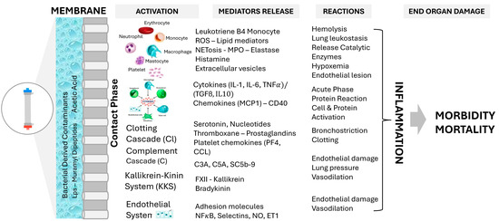The activation of various protein cascades (coagulation, complement, kinin–kallikrein) and circulating cells (platelets, leukocytes) induced by contact with the extracorporeal circuit triggers the release of proinflammatory mediators (cytokines, granulocyte enzymes) and reactive oxygen species from leukocytes, ultimately leading to oxidative stress and inflammation [48,49]. These reactions amplify and extend the process, inducing the production of acute phase reactants by the liver in a broader reaction called inflammasome production [60]. Microbial impurities (e.g., endotoxin, LPS, muramyl dipeptides) in the dialysis fluid can enhance and catalyze these hemobiological reactions [61]. The repeated cycles of hemoincompatible phenomena, triggering and maintaining low grade inflammation, contribute to end organ damage and increased mortality [62,63].