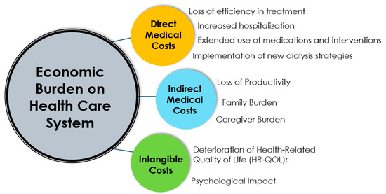 The economic impact of hemoincompatibility can be substantial in the overall cost of kidney replacement therapy, even though it is difficult to disentangle efficiency and hemocompatibility [154,155,156]. This impact includes direct medical costs, indirect costs, and intangible costs. This is briefly schematized in Figure 3.
