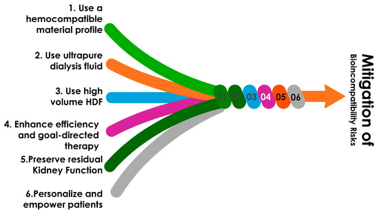 Proposed strategies to mitigate risk associated with bioincompatibility reactions associated with chronic hemodialysis.