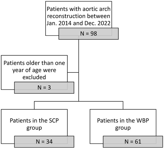 We retrospectively screened all paediatric patients under one year of age who underwent aortic arch surgery at the University Hospital Tübingen from January 2014 to December 2022. Patients were eligible for this study if they underwent surgeries such as the Norwood procedure, Damus–Kaye–Stansel anastomoses or an aortic arch reconstruction due to hypoplasia, either as a primary or a redo surgery. Figure 1 shows a patient selection chart. Before January 2017, all patients undergoing any of these procedures were treated with SCP and moderate hypothermia (26–28 °C). After January 2017, a WBP technique was implemented in our centre consisting of the standard SCP with LBP and mild hypothermia (30–32 °C). All paediatric patients undergoing aortic arch surgery after this date were treated with WBP. After selection, there were 61 patients in the WBP group and 34 patients in the SCP group. All patients were treated by the same experienced surgeon, perfusionist and the same team of experienced cardiac anaesthesiologists throughout the treatment period.
