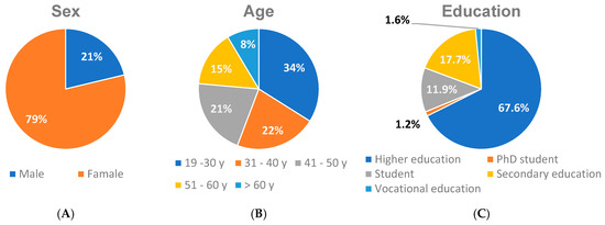 The characteristics of the study group: (A) sex, (B) age, and (C) education.