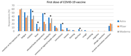 First dose of COVID-19 vaccine adverse reactions. The percentage of reported adverse reactions after the first dose of AstraZeneca, Pfizer, and Moderna vaccines. Statistically significant differences (p < 0.05) are marked with “*”.