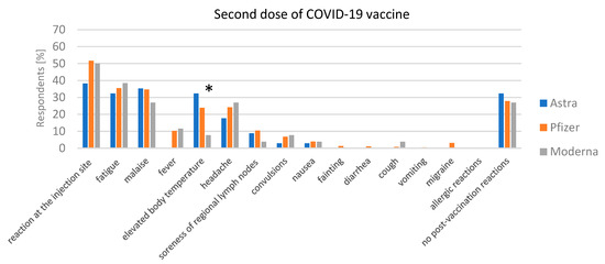 Second dose of COVID-19 vaccine adverse reactions. Comparison of the frequency of adverse reactions after the second dose of AstraZeneca, Pfizer, and Moderna vaccines. Statistically significant differences (p < 0.05) are marked with “*”.