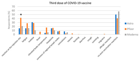 Third dose of COVID-19 vaccine adverse reactions. Reported adverse reactions after the third dose of AstraZeneca, Pfizer, and Moderna vaccines. Statistically significant differences (p < 0.05) are marked with “*”.