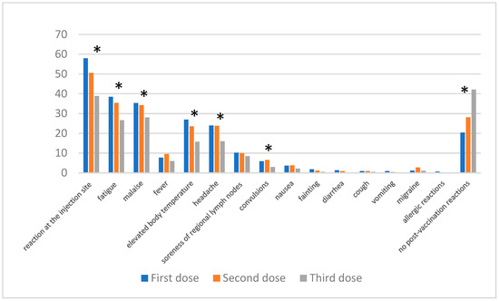 Post-vaccination reactions were reported after the 1st, 2nd, and 3rd doses of vaccine in all vaccinated respondents. “*” denotes statistical significance between the reported adverse events of individual doses.