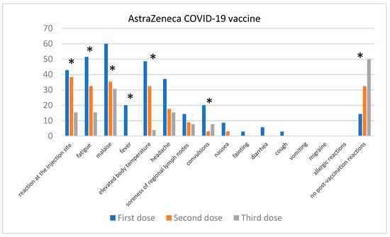 Post-vaccination reactions reported after 1st, 2nd, and 3rd dose of AstraZeneca vaccine. “*” denotes statistical significance between the reported adverse event in the individual doses.