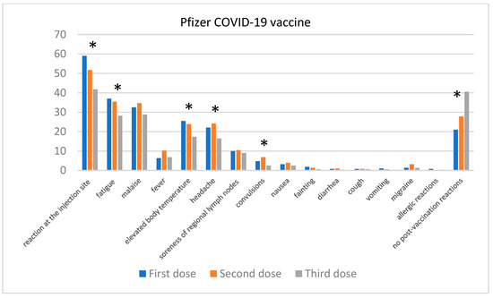 Post-vaccination reactions were reported after the 1st, 2nd, and 3rd doses of the Pfizer vaccine. “*” denotes statistical significance between the reported adverse events of individual doses.