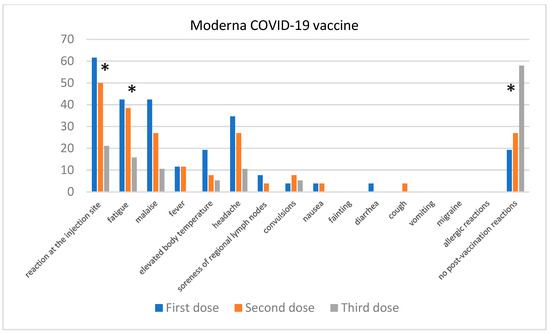 Post-vaccination reactions were reported after the 1st, 2nd, and 3rd doses of the Moderna vaccine. “*” denotes statistical significance between the reported adverse events of individual doses.