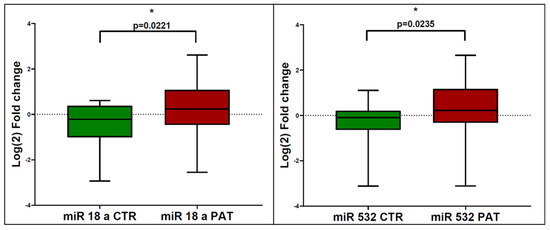 Comparison of serum levels of miR-18a and miR-532 between eCCA patients (PAT) and controls (CTR). The relative expression of circulating miR-18a and miR-532 in serum is expressed as Log(2) of the fold change calculated as 2−ΔΔCT values. The median value for miR-18a in controls is −0.2170 and 0.2404 for patients, while the median value for miR-532 in controls is −0.09518 and 0.2188 for patients. (* p < 0.05).