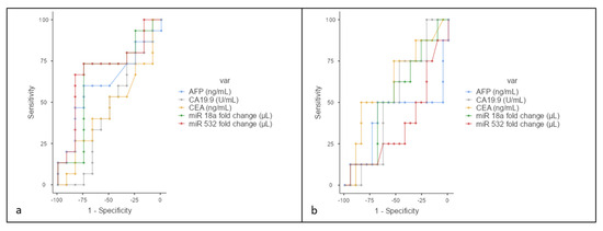 No significant differences were observed in miR-18a, miR-532, CA19.9, CEA, and AFP levels regarding vascular invasion (miR-18a: p = 0.21; miR-532: p = 0.10; CA19.9: p = 0.64; CEA: p = 0.75; AFP: p = 0.34). To predict vascular invasion, for a miR-18 cutoff of 1.54, the sensitivity was 73.3%, specificity was 75%, positive predictive value (PPV) was 78.5%, and negative predictive value (NPV) was 69.23%, with an area under the curve (AUC) of 0.64. For a miR-532 cutoff of 1.88, the sensitivity was 66.6%, specificity was 83.3%, PPV was 83.3%, and NPV was 66.6%, with an AUC of 0.689 (Figure 4a).