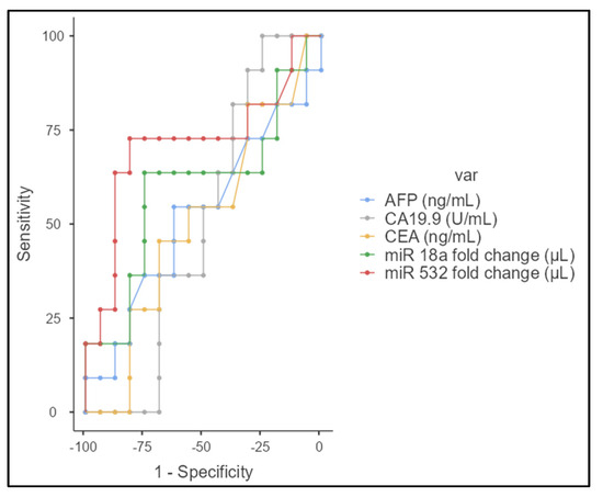 Regarding the capacity to evaluate tumor resectability, a good prediction model was observed for miR 532 at a cut-off point of 2.12 (Se = 72.73%; Sp = 81.25%; AUC = 71.3%), respectively, for miR 18a at a cut-off 1.83 (Se = 63.64%; Sp = 75%%; AUC = 59.7%) in comparison with classical tumor markers (Figure 5).