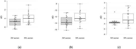 Differences in gene expression levels (ΔCt values) in endometrial tissues between RIF and RPL patients: (a) IL15 gene; (b) IFNG gene; (c) HPRT1 gene.