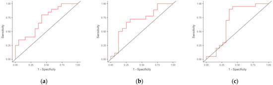 Most of the statistical analyses were performed in the Jamovi program (https://www.jamovi.org, accessed on 5 September 2024). The statistical significances of the differences in the ΔCt values between the groups were calculated using the two-tailed Mann–Whitney U test. Spearman’s rank correlation method was used to examine the relationships between the quantitative variables, and p < 0.05 was considered as statistically significant. Because of the explorative nature of this study, no adjustments for multiple testing were performed. For a comparative visualization of the gene expression levels, boxplots were constructed using a web tool, BoxPlotR (http://shiny.chemgrid.org/boxplotr, accessed on 5 September 2024). The characteristics of the markers were evaluated by ROC analysis using the web tool easy ROC v.1.3.1 [23] and Jamovi. Youden’s index method was used to calculate the optimal cut-off points. The evaluation of classifiers by the interpretation of the area under the ROC curve (AUC) was performed as described by [24].