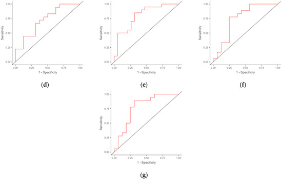 ROC curves for potential markers and combinations of markers in the discrimination of RIF and RPL in women. The ROC curves (red lines) allow for the evaluation of the quality of the binary classifications by displaying the relationship between sensitivity and specificity as the decision threshold is varied: (a) IL15; (b) IFNG; (c) HPRT1; (d) combination of IL15 and IFNG; (e) combination of IL15 and HPRT1; (f) combination of IFNG and HPRT1; (g) combination of IL15, IFNG, and HPRT1.