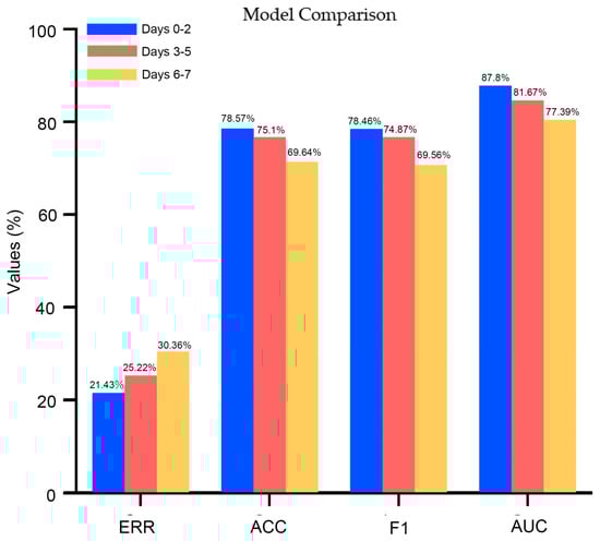 Illustrates the performance metrics of models trained with the following three different periods: Days 0–2, Days 3–5, and Days 6–7. The metrics include Error Rates (ERRs), Accuracy, F1 Scores, and Area Under the Receiver Operating Characteristic Curve (AUROC).