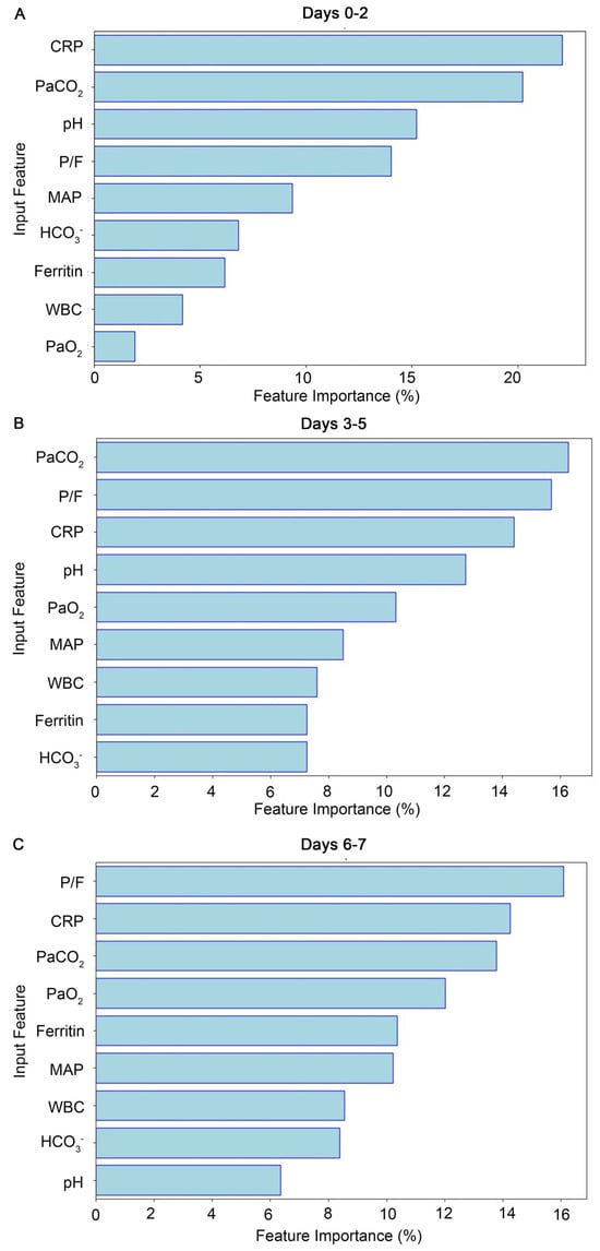 Shows the feature importance for predicting survival (with successful weaning) versus non-survival using data from Days (A) 0–2, (B) 3–5, and (C) 6–7. During days 0–2, CRP is the most important feature, followed by PaCO2, pH, and P/F ratio.