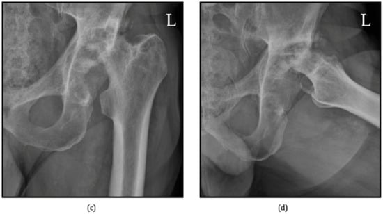 Bilateral RPOH in a 54-year-old male patient—AP views of the coxo-femoral joint ((a) right side, (c) left side) and axial views of the coxo-femoral joints ((b) right side, (d) left side). Marked bone resorption can be observed in both hips, involving both the femoral head and the acetabulum (source: personal archive).