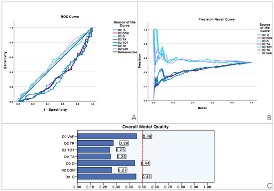 Visualization of model quality by using ROC curves and Precision-Recall curves for each domain of the Rey-Osterrieth Complex Figure (ROCF). The ROC curve (A) shows the trade-off between sensitivity and specificity for each domain while the Precision-Recall curve (B) further details the performance of these domains. The bar charts (C) quantify the overall model quality for each domain.