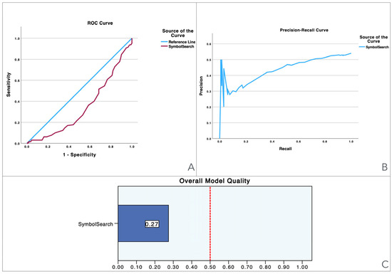 Visualization of model quality by using ROC curves and Precision-Recall curves for the Symbol Search. The ROC curve (A) shows the trade-off between sensitivity and specificity while the Precision-Recall curve (B) further details the performance of the variable. The bar charts (C) quantify the overall model quality.
