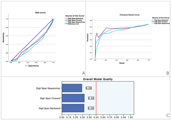 To provide a visual illustration of these findings, Figure 1, Figure 2, Figure 3, Figure 4, Figure 5 and Figure 6 illustrate the discriminant capacity of each domain: visuospatial memory (ROCF, Figure 1), selective attention (d2 test, Figure 2), processing speed (Symbol Search, Figure 3), working memory (Digits D/R/I, Figure 4), planning or decision (Zoo Map, Figure 5), and mental inhibition (Five Digit Test, Figure 6) by providing their ROC curves, Precision-Recall curves, and a summary of the overall model quality. As can be observed, mental inhibition, as evaluated by FDT-based outcomes, stands out with the highest AUC, indicating superior discriminatory power compared to the remaining neurocognitive variables and executive functions.