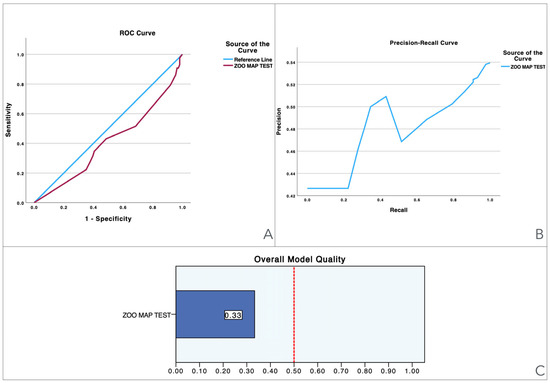 Visualization of model quality by using ROC curves and Precision-Recall curves for the Zoo Map Test. The ROC curve (A) shows the trade-off between sensitivity and specificity while the Precision-Recall curve (B) further details the performance of the variable. The bar charts (C) quantify the overall model quality.