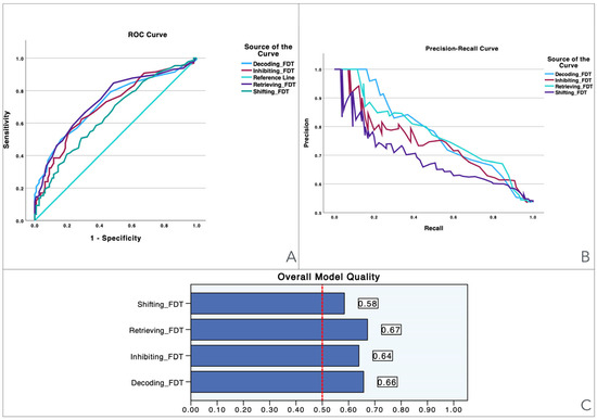 Visualization of model quality by using ROC curves and Precision-Recall curves for each domain of the Five Digit Test (FDT). The ROC curve (A) shows the trade-off between sensitivity and specificity for each domain while the Precision-Recall curve (B) further details the performance of these domains. The bar charts (C) quantify the overall model quality for each domain.