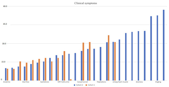 Following the previous study by Skrahina et al. [8], we estimated the prevalence of symptoms associated with PNP and CM (Figure 1). In cohort 1, the most common symptoms included tingling and numbness (67%), fatigue (47%), and weakness (45%), and less common symptoms included a loss of smell (6%) and enlargement of the heart (1%). In cohort 2 the main symptoms were: pain, tingling, and numbness present in over 50% of participants. Less common symptoms included anemia (10%), bouts of constipation and diarrhea (10%), and erection problems (75% of men).