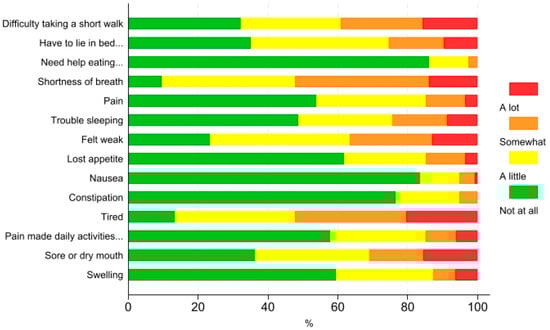 The PRO-Pall assesses physical, psychosocial, and existential issues through 24 items: 15 from the European Organization for Research and Treatment of Cancer Quality of Life Questionnaire Core 15 Palliative Care (EORTC-QLQ-C15-PAL) [18], 3 from the EORTC item library (oedema, loneliness, intimacy/sexual health) [19], 5 newly developed items (sore and dry mouth, social support, practical support, existential problems) [20], and 1 Write In Symptoms/Problems (WISP) [21] item allowing adding up to three additional, free-text issues. The complete PRO-Pall tool can be found in Table A1. In a previous feasibility study of the PRO-Pall, 79% of patients reported spending 15 min or less completing the questionnaire [20].