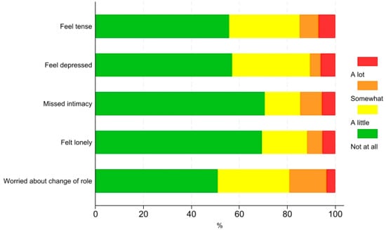 Statistically significant differences between males and females were observed for the PRO-Pall items ‘have to lie in bed or sit in a chair during the day’ (p = 0.015) (Figure 4) and ‘missing intimacy’ (p = 0.037) (Figure 5). No statistically significant gender differences were found for the remaining PRO-Pall items.