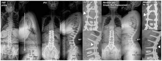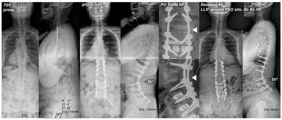 In general, patients with RF are strongly advised to undergo revision not only to reduce associated pain but also to prevent the potential deterioration of sagittal balance that may result from the collapse of the vertebral body at the PSO site [3]. Although a revision surgery for RF is traditionally performed through rod replacement and supplementary posterior fusion, several alternative methods have been introduced in recent years to enhance fusion above and below the osteotomy site through a minimally invasive lateral approach and to increase both the stiffness and stability of the construct by inserting accessory rods into previous instrumentation [8,9].