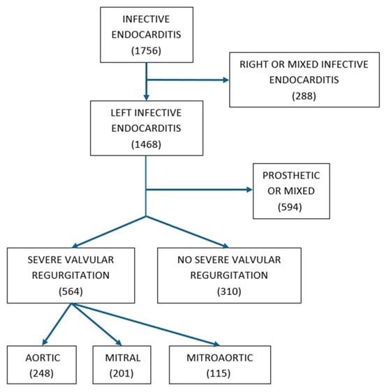 Heart failure worsens the prognosis of patients with left-sided infective endocarditis (IE) and represents the main surgical indication in these patients [,]. In most patients, heart failure results from severe valvular regurgitation, which affects up to 55% of patients with left-sided IE, according to previous studies [,]. Hypothetically, the presence of severe valvular regurgitation in patients with native left-sided infective endocarditis (NLSIE) is associated with an increased risk of heart failure and the need for surgery; it could be caused by more aggressive micro-organisms and might be associated with a poorer outcome. However, these hypotheses remain unsettled, as there is no study focused on this specific group of patients. Given its high prevalence, it is important to know whether severe valvular regurgitation entails clinical or prognostic specific issues.