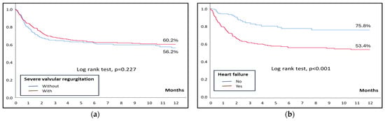 (a) Kaplan–Meier curves for 1-year mortality in patients with and without severe regurgitation. (b) Kaplan–Meier curves for 1-year mortality in patients with severe regurgitation, with and without heart failure.
