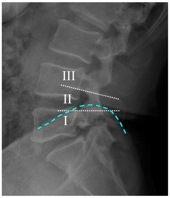 Method of categorizing crest levels into three groups based on the relationship between the height of the iliac crest (light blue dotted line) and the L4 and L5 pedicles on lumbar lateral radiographs. The white dotted lines represent the lower edge of the L4 pedicle and the upper edge of the L5 pedicle. I represents the iliac crest height below the upper edge of the L5 pedicle; II indicates the iliac crest height between the lower edge of the L4 pedicle and the upper edge of the L5 pedicle; and III represents the iliac crest height above the lower edge of the L4 pedicle.