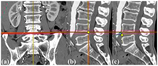 The iliac crest height was also quantitatively assessed on coronal and sagittal CT images using the Picture Archiving and Communication System (PetaVision for Clinics, 3.1; Korea University Anam Hospital, Seoul, Republic of Korea). The assessment process first defined a tangential line touching both iliac crests in the coronal plane (Figure 2a). The red line serves as a reference for subsequent measurements. In Figure 2b,c, the minimum distance between this tangential line and the reference point in the L4–5 disc space was measured (sky blue arrow). To minimize potential rotational errors caused by the patient lying obliquely on the CT table, an axis passing through the ventral edge of the L4–5 disc space was established in the sagittal plane. This axis touches both iliac crests cranially and tangentially. The shortest distance from this line to the center of the ventral edge of the L4–5 disc space was evaluated as the iliac crest height relative to the L4–5 disc space. Additionally, CT scans were used to assess the presence of disc pathology, including the vacuum phenomenon and endplate sclerosis, and to measure both anterior and posterior disc heights.