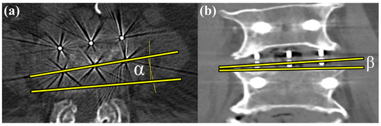 Measurement of cage insertion angles. (a) In the axial plane, the angle (α) formed between the long axis of the disc space and the long axis of the cage, measured using radiographic markers, is defined as the axial plane insertion angle. Positive angles are assigned to cages inserted from the left anterior to the right posterior position. (b) In the coronal plane, the angle (β) formed between the line parallel to the L5 upper endplate and the long axis of the cage, measured using radiographic markers, is defined as the coronal plane insertion angle. Negative angles are assigned to cages inserted from the left cranial to the right caudal direction.