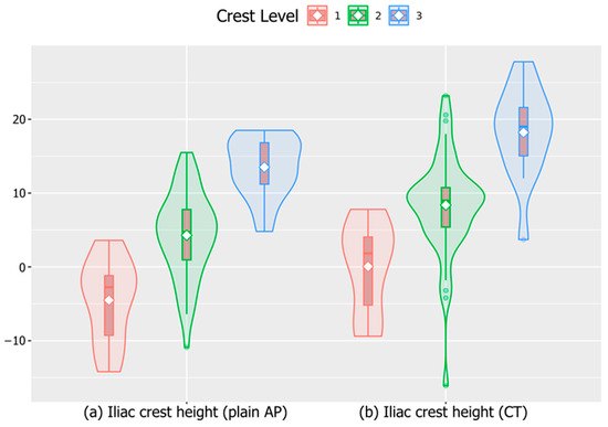 Quantitative comparison of iliac crest height among the three crest level groups. (a) Distance measured from the highest points of the iliac crest to the midpoint of the L4–5 disc using plain AP radiographs. (b) Distance measured between the iliac crest height and midpoint of the L4–5 disc space by CT. Both measurements showed significant differences across the three groups, with p < 0.001. AP, anteroposterior; CT, computed tomography.