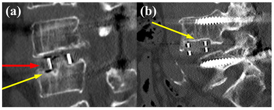 Typical cases of postoperative cage subsidence following OLIF at the L4–5 level. (a) Subsidence at the L5 upper endplate (yellow arrow) with a decrease in disc height and air accumulation at the graft site, suggesting non-union (red arrow). (b) Subsidence occurring at the L4 lower endplate (yellow arrow).