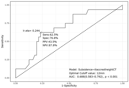 Additionally, the ROC analysis based on the logistic regression results identified the iliac crest height measured by CT as a significant factor associated with subsidence, yielding an AUC of 0.688. The analysis determined a cutoff value of 12 mm, indicating that an iliac crest height >12 mm measured by CT is associated with a higher likelihood of subsidence in L4–5 procedures (Figure 7).