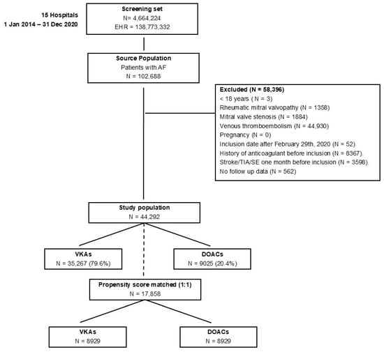 Flow chart with an overview of the patient selection methodology. The initial screening set for our study comprised over 4.6 million patients at participating hospitals, processing nearly 139 million EHRs. The application of exclusion filters (age <18 years, rheumatic mitral valvopathy, mitral valve stenosis, venous thromboembolism, pregnancy, previous anticoagulant therapy, recent stroke, TIA or SE, no follow-up data, and the cutoff date to mitigate COVID-19 impacts) defined a study population of 44,292 patients with atrial fibrillation (AF), with 35,267 (79.6%) on VKAs and 9025 (20.4%) on DOACs. Patients on VKAs and DOACs were matched using propensity score matching (PSM) to ensure balanced groups for comparative analysis.