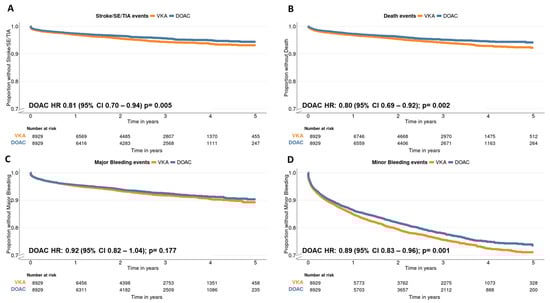 After PSM, up to 8929 patients from each group, VKAs and DOACs, were analyzed (Figure 1). The Love plot indicated a correct covariate balance, with a standardized mean difference lower than 10% for all confounders (Supplementary Figure S1). Patients on DOACs experienced fewer stroke/SE/TIA events than those on VKAs, with a significantly lower risk for its development (HR: 0.81, 95% CI 0.70–0.94; p = 0.005), as illustrated in Figure 2A. Patients on DOACs also exhibited a lower proportion and risk of death compared to those in the VKA group (HR: 0.80, 95% CI 0.69–0.92; p = 0.002), as depicted in Figure 2B. There were no differences between DOAC and VKA patients in major bleeding events (Figure 2C). However, the DOAC group presented a lower risk of minor bleeding events (HR: 0.89, 95% CI 0.83–0.96; p = 0.001, Figure 2D). The 5-year risk difference (comparing DOAC treatment vs VKA treatment) for stroke/SE/TIA was −1.31 per 100 persons (95% CI: −1.51,−1.11 per 100 persons); for death, it was −1.67 per 100 persons (95% CI: −3.15, 1.34 per 100 persons); for major bleeding, −1.10 per 100 persons (95% CI: −3.15, 1.34 per 100 persons); and for minor bleeding, −3.59 per 100 persons (95% CI: −3.96, −3.22 per 100 persons).