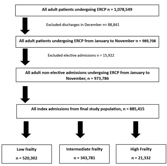 15]. However, there is a significant paucity of data on the impact of frailty in individuals receiving ERCP, particularly in an inpatient setting. Hence, in this study, we aimed to evaluate the utility of the HFRS in predicting outcomes for inpatient use of ERCP. We used one of the largest publicly available healthcare databases, the nationwide readmissions database (NRD), to study the impact of the HFRS on readmission rates, inpatient mortality, and the healthcare burden in the United States (US).