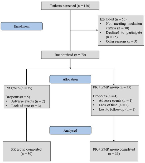 The attrition rate was calculated based on the total number of participants at the start of the study and the number of participants who dropped out or did not complete the intervention. In this study, of the total of 61 patients initially enrolled, 30 were assigned to the pulmonary rehabilitation (PR) program, and 31 received progressive muscle relaxation (PMR) as an additional intervention.